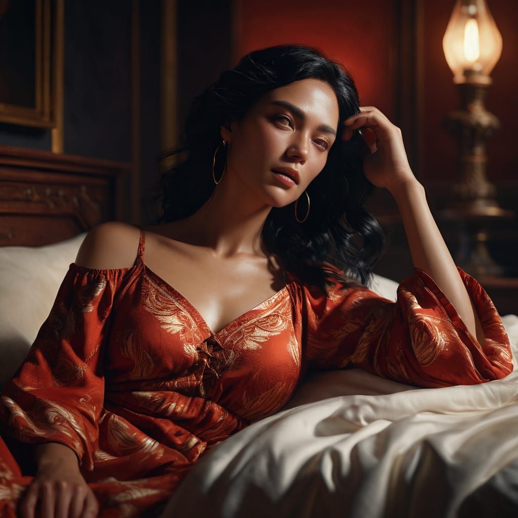 A vibrant oil painting of a young woman in bed, wearing a red nightgown. The image features soft, golden lighting and intricate details in a warm, cozy bedroom, rendered as detailed matte painting.