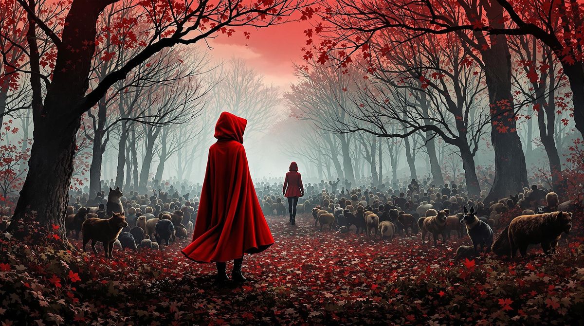 A striking 16mm film-style poster of Red Riding Hood, featuring a crowded establishing shot in vibrant, gritty colors with a retrofuturistic aesthetic.