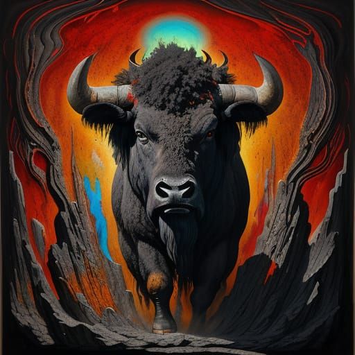 This surreal image captures a dreamlike scene of ancient bison and other animals on a winding cave wall, bathed in flickering torchlight and deep red ochre hues, with bold strokes and stippling creating a lifelike, three-dimensional effect.