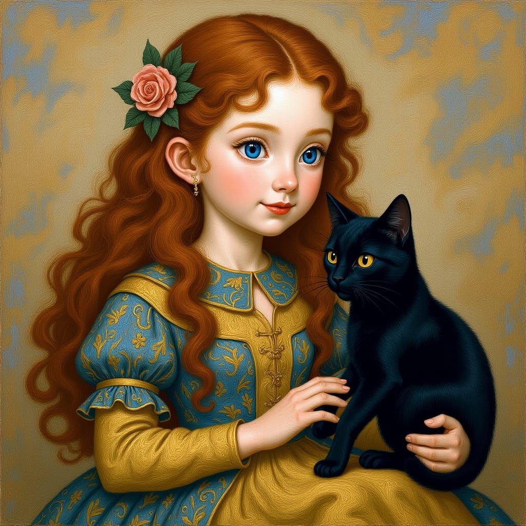 This enchanting portrait features a girl with vibrant red hair and blue eyes, holding a black cat. The artwork is in a painterly style with rich textures and warm tones, reminiscent of Klimt's decorative art.