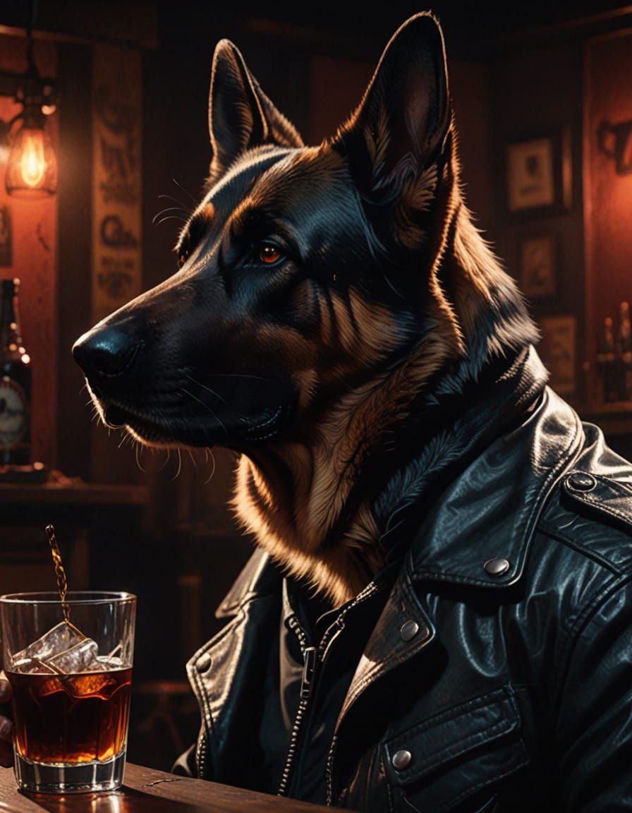 This image is a close-up of a German Shepherd in a leather jacket, drinking whiskey from the bottle in a dimly lit, moody environment, reminiscent of dark fantasy art with high contrast and cinematic quality.