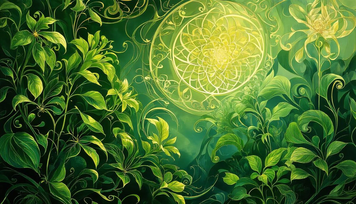 This image features abstract Art Nouveau plants in lush greens interacting with elegant geometric designs. Volumetric lighting creates depth and highlights luminous details, evoking organic flow.