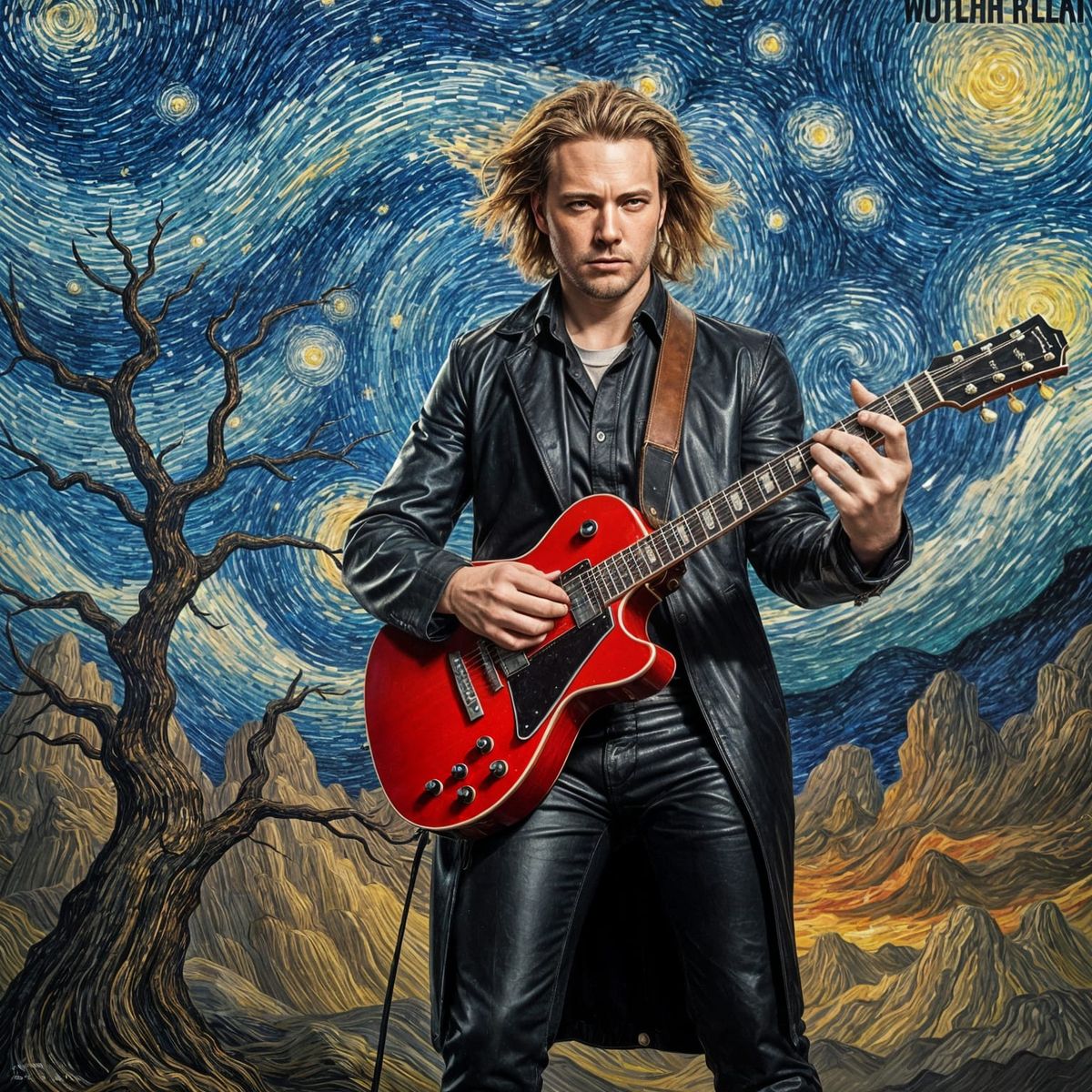 This enigmatic image captures a young musician in a haunting, starry night landscape, with a guitar and long leather coat evoking a sense of dark fantasy and mystique, reminiscent of classic art rock and mid-century album covers.