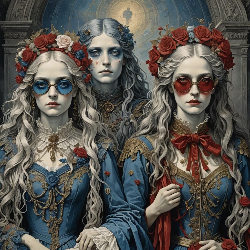 This image shows two older women in elaborate outfits standing near a landscape of waterfalls and cliffs. The image is rendered in a gothic horror style, with close attention to detail.