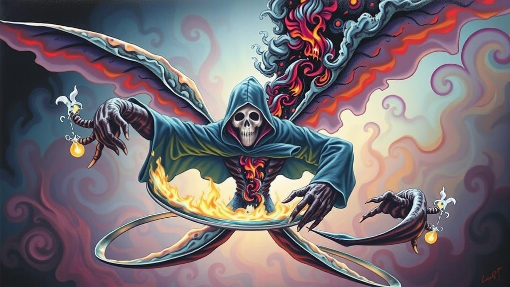 This image shows a spectral figure cloaked in darkness, positioned within an infinite Möbius Loop. The figure is encircled by a surreal, fiery blaze, rendered with vibrant colors and mystical symbolism akin to modern abstract art.