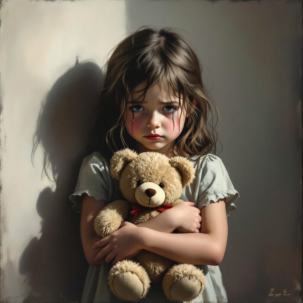 This image shows a young girl with tear-streaked cheeks holding a teddy bear, bathed in soft, melancholic light. Rendered in a textured, painterly style with a muted color palette, it evokes a sense of solitude and sadness.