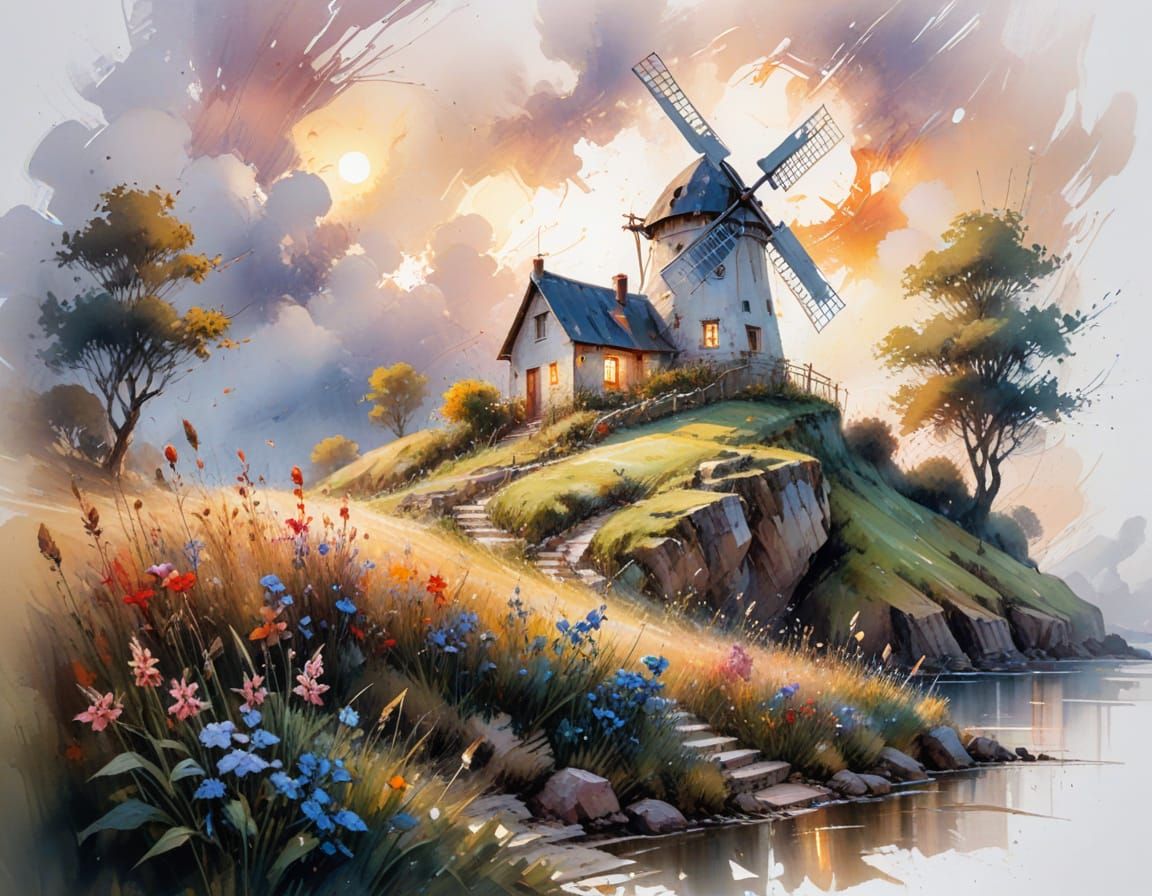 A neo-impressionist oil painting depicting a cozy cottage nestled on a hill with a nearby windmill. The artwork employs rich textures, dynamic brushstrokes, and warm lighting as a watercolour.