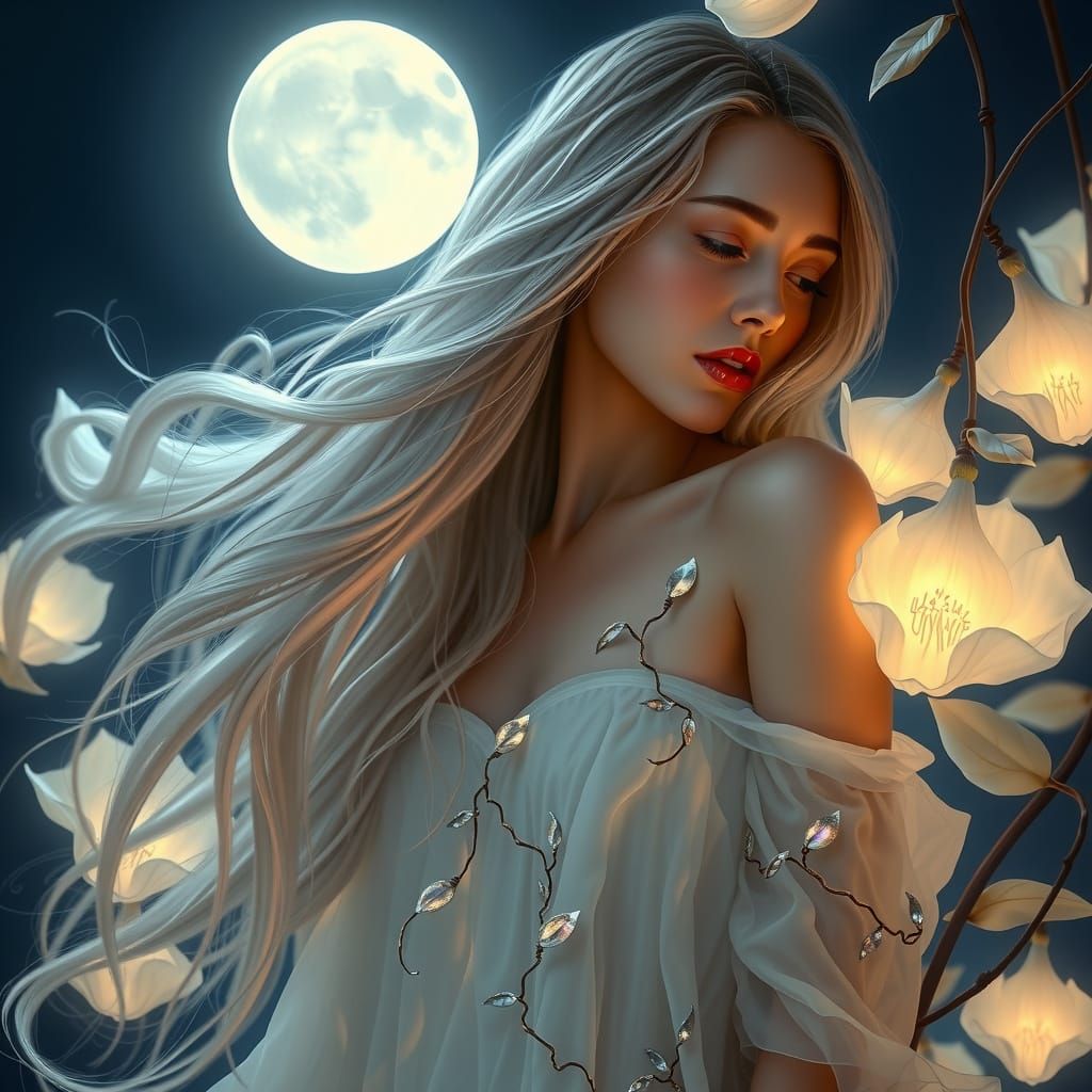 A mystical, nocturnal scene featuring a woman surrounded by Ipomoea alba, the Moonflower, in full bloom, as if summoned by the lunar prophecy. Soft, ethereal light emanates from the night-blooming flowers, casting an otherworldly glow on the woman's delicate, dreamy features. Her long, flowing hair ...
