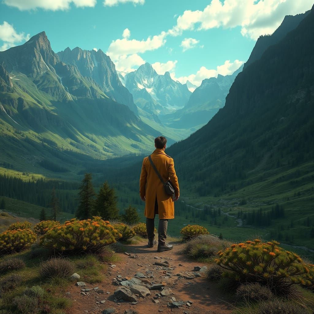 A lone figure stands in a stunning landscape of lush greenery and towering mountains. The hyperrealistic image features rich, warm colors, dramatic lighting, sharp focus and a cinematic feel.