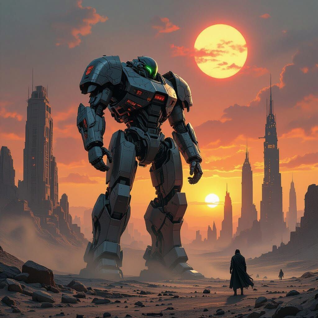 A towering mech warrior protects a desolate alien city. The scene blends ancient ruins with futuristic skyscrapers in a dark fantasy style, with industrial and grungy undertones.