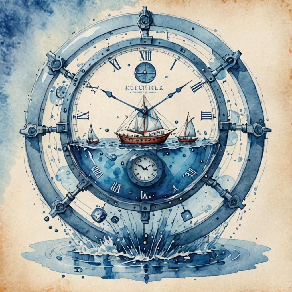 Aquarelle of a translucent dice boat floating to a portal with a blue clock. This watercolor art piece features a unique and imaginative scene.