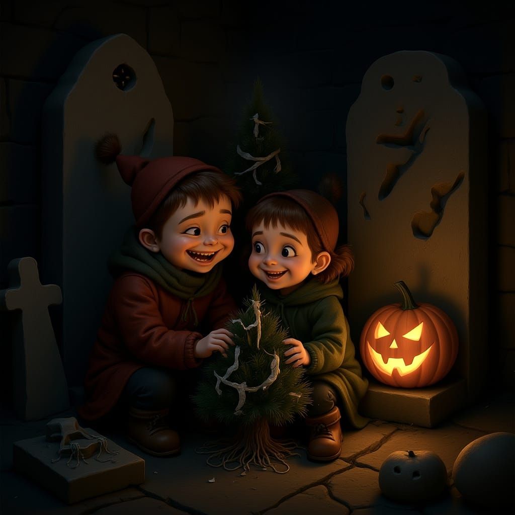 This image depicts two children finding shelter in a mausoleum during a winter storm, decorating a Christmas tree with crypt findings. A Jack O'lantern provides a warm glow in a dark, painterly fantasy style.