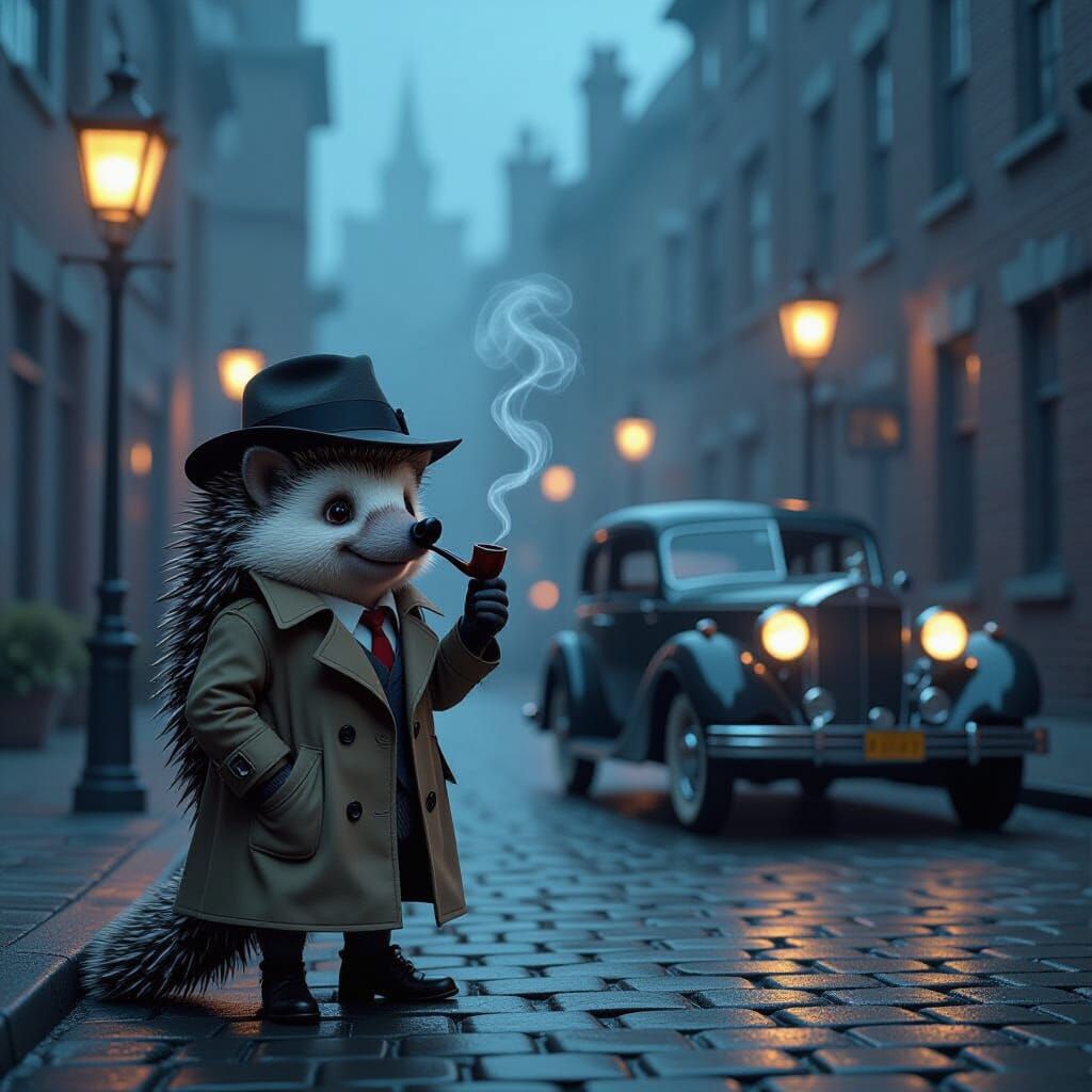 This image depicts a hedgehog detective in a trench coat and fedora, smoking a pipe on a misty street. Cinematic lighting enhances the mysterious, vintage atmosphere.