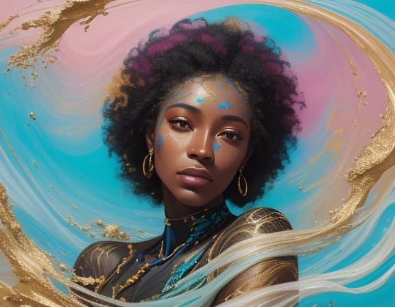 This stunning oil painting features an abstract portrait of a Black woman emerging from swirling silk and sand. Ethereal forms and a vibrant, dreamlike palette create a radiant and dynamic masterpiece.