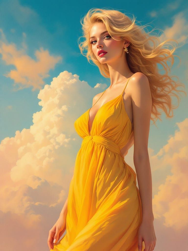 This image features a full-body portrait of a blond pin-up woman with pink-tipped hair making direct eye contact. It blends dynamic brushwork, luminous color, and mid-century modern optimism for an accessible, elegant feel.