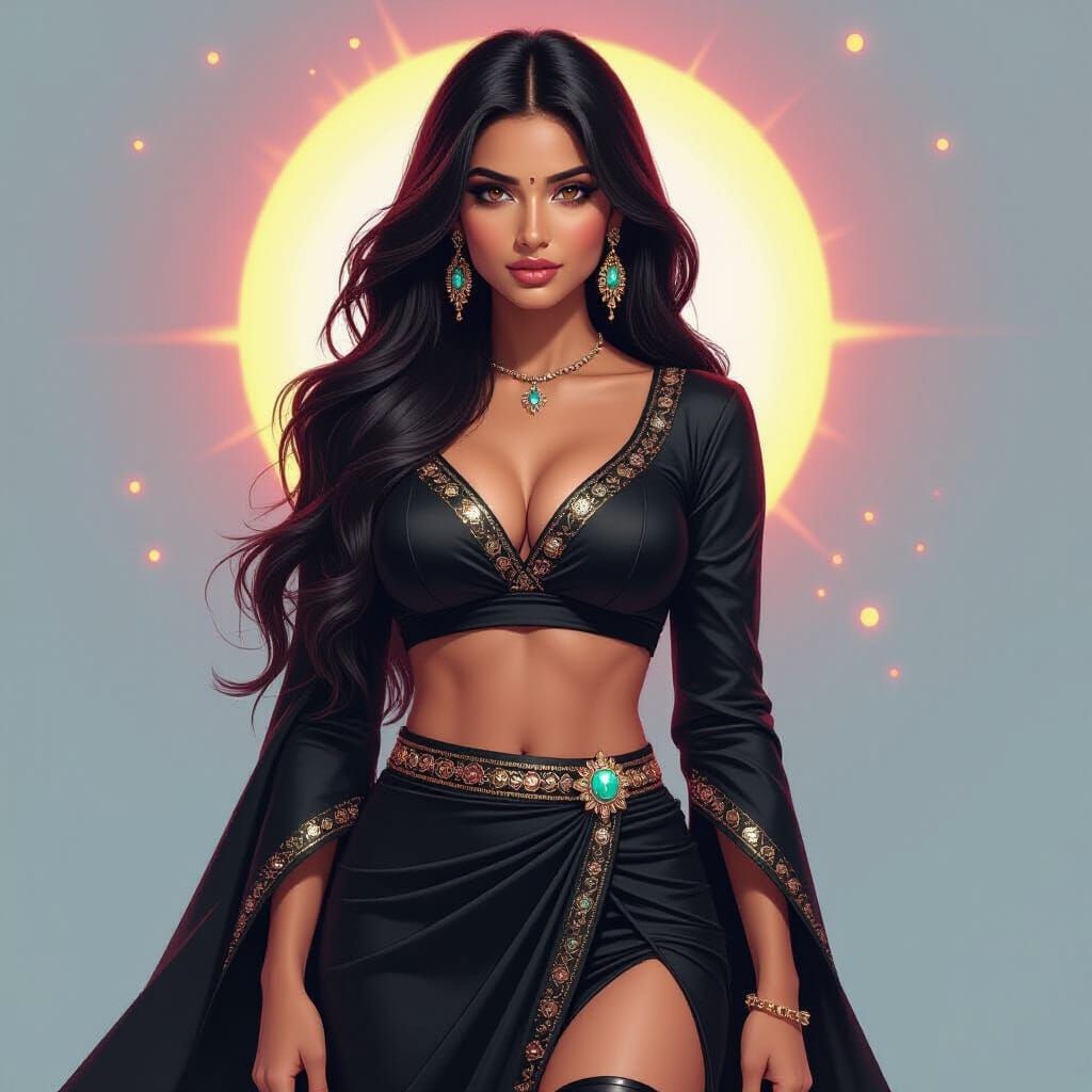 This hyperrealistic concept art features a 28-year-old Indian woman with long black hair, brown skin, and unique crystal star eyes. She wears a detailed black traditional dress with pants, set against a vibrant, abstract background.