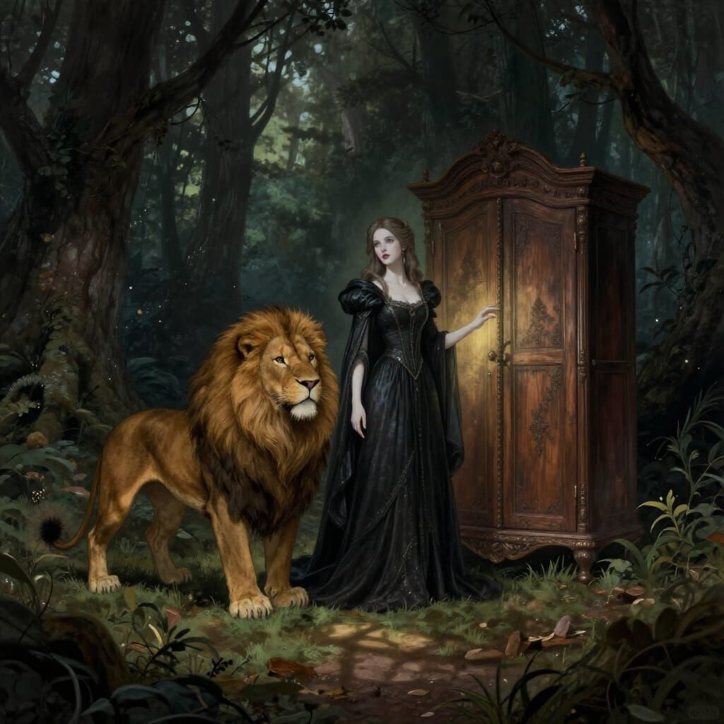 This image depicts a regal lion, a sorceress, and a wooden wardrobe in a dark fantasy style. Ethereal light and dramatic shadows create a mystical atmosphere in the enchanted forest clearing.