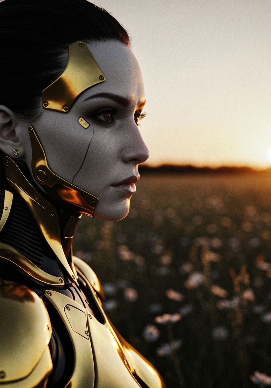 This image shows a beautiful cyborg woman with an intense gaze standing in a field of wildflowers. Golden light illuminates her face in this black and white portrait with a shallow depth of field.