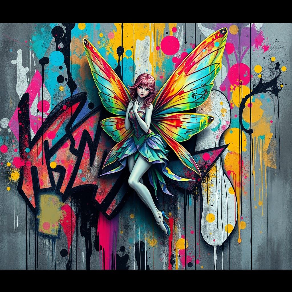 This image showcases a vibrant fairy surrounded by dynamic graffiti, abstract street art, and ultra detailed textures in a colorful, high contrast style reminiscent of ultra-quality art.