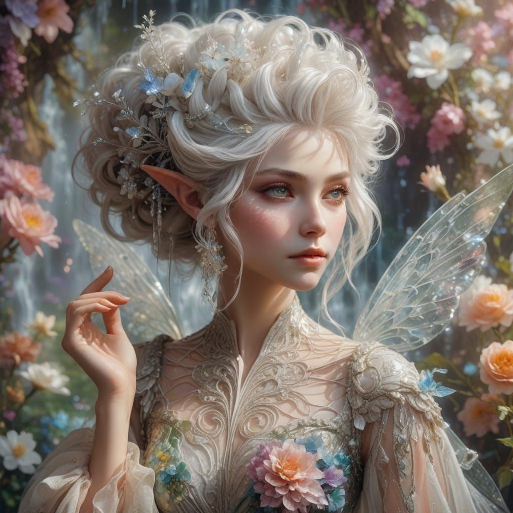 This image shows a beautiful, slightly shy elf with shimmering white hair intricately styled with braids and silver threads. Her translucent skin glows ethereally in this detailed anime fantasy art piece.