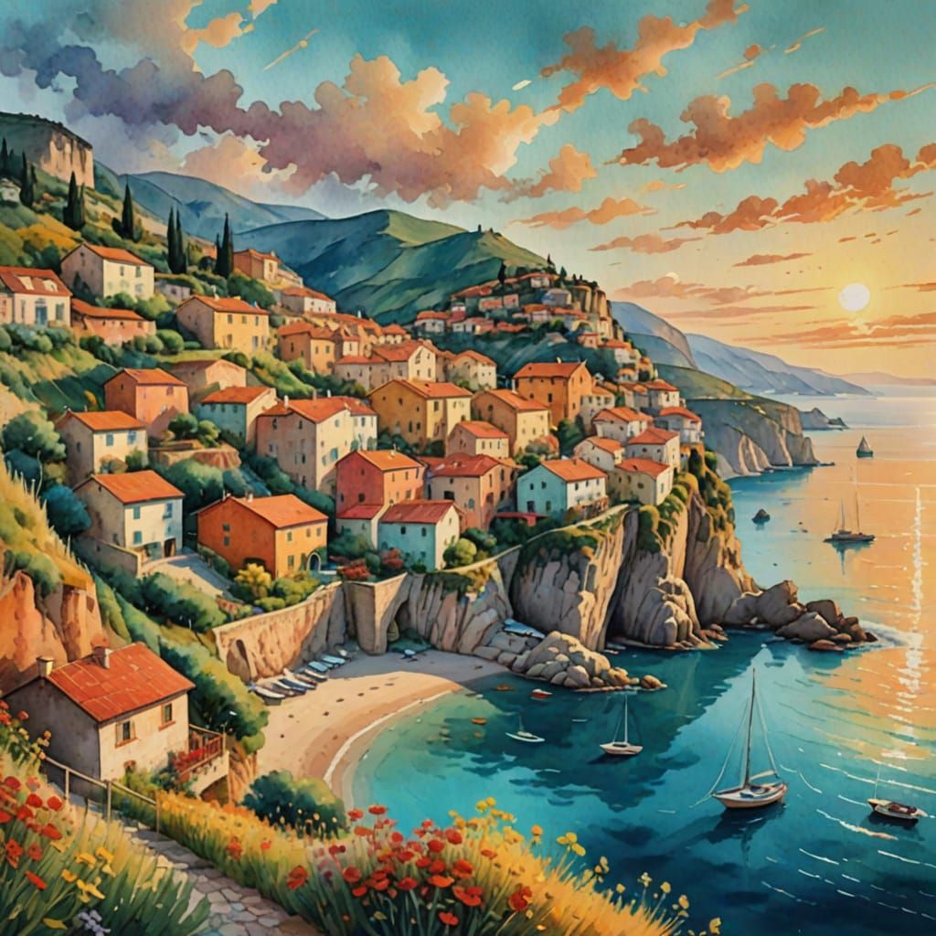 This image shows an Italian coastal village nestled on steep cliffs at sunset. The watercolor painting features white cottages, red-tiled roofs, sailboats on a turquoise sea, and vibrant wildflowers.