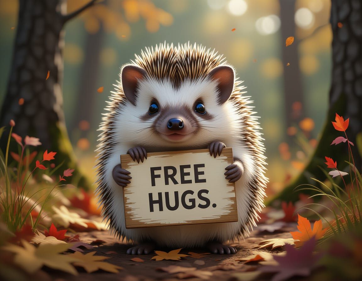 A hyper-realistic digital artwork presents an endearing hedgehog offering 'free hugs' within a fantastical forest setting. The art style features dramatic lighting and intricate details in a fantasy realism aesthetic.