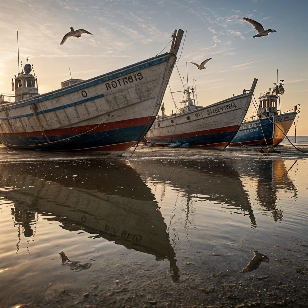 This image shows fishing boats on a sandy shore at sunrise. Golden rays reflect off the wet sand, with fishermen and seagulls nearby. The picture captures the scene in a hyper-realistic, cinematic style.