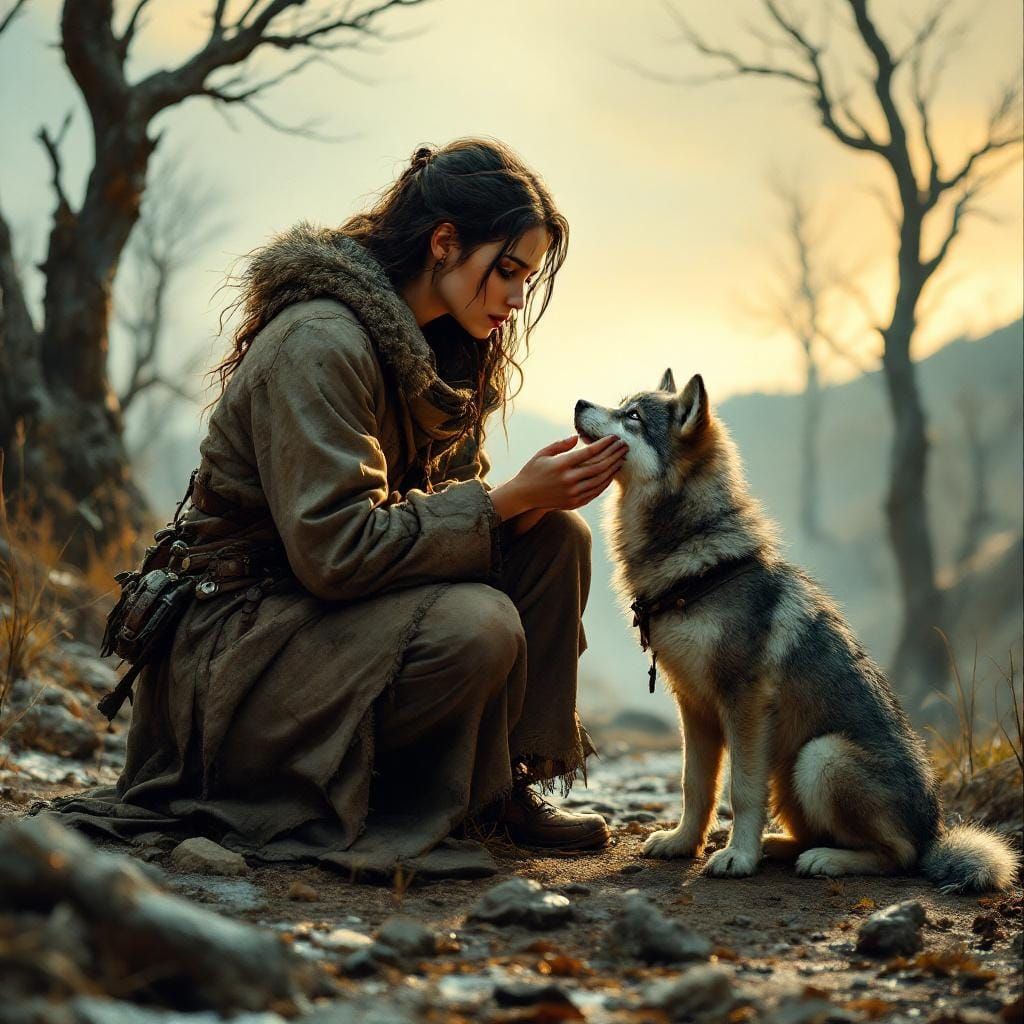 This image shows a young woman kneeling to greet a wolf pup in a desolate, post-apocalyptic world. The scene is reminiscent of fantasy art, with gritty textures and deep colors.
