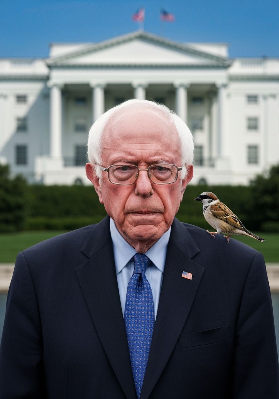 This image depicts a portrait of President Bernie Sanders in front of the White House, with a sparrow perched on his shoulder. The image conveys a sense of leadership.
