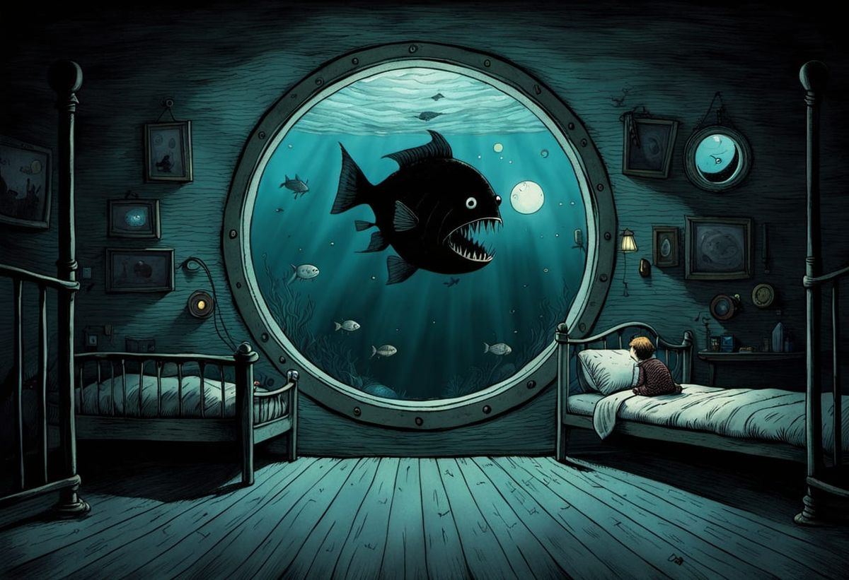 This image shows a child in an underwater bedroom, peering out of a submarine window. A spooky anglerfish swims past, its bright light illuminating the eerie, whimsical scene in a retro aesthetic.