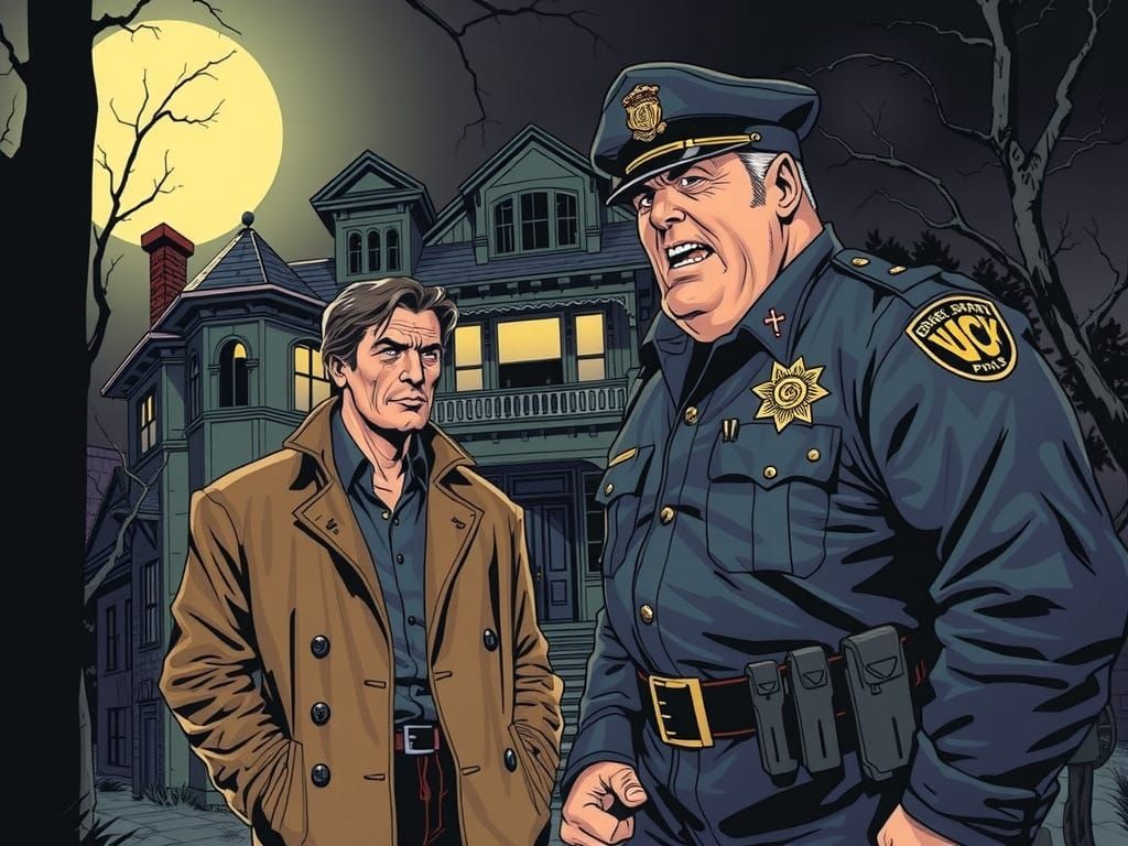 A comic book illustration of a detective facing a police officer outside a mansion. The artwork features bold lines, stark shadows, and high contrast in a noir style.