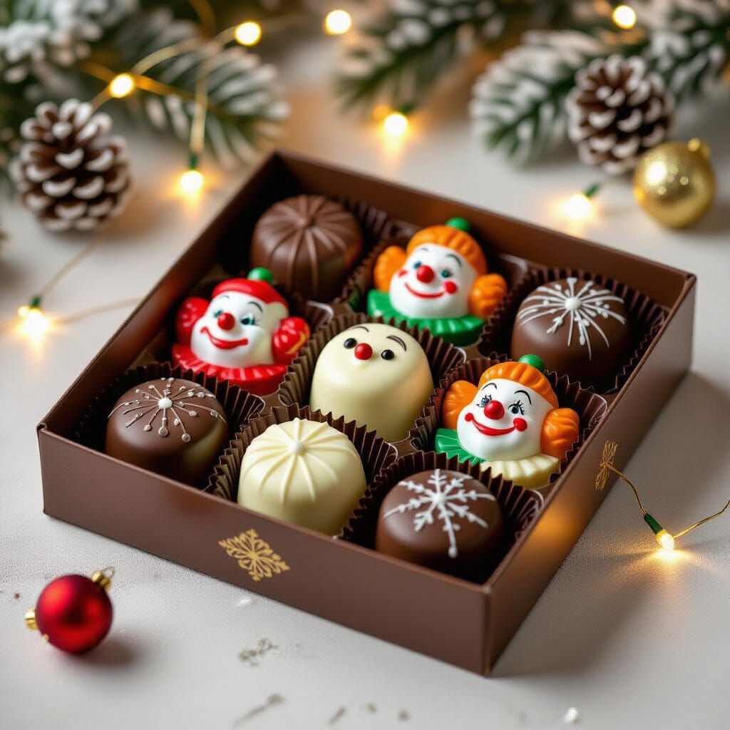 This image showcases a box of assorted clown-shaped chocolates made from dark, white, and milk chocolate. Rendered in a vibrant, illustrative style like children's book art, it has a playful charm and warm holiday feel.