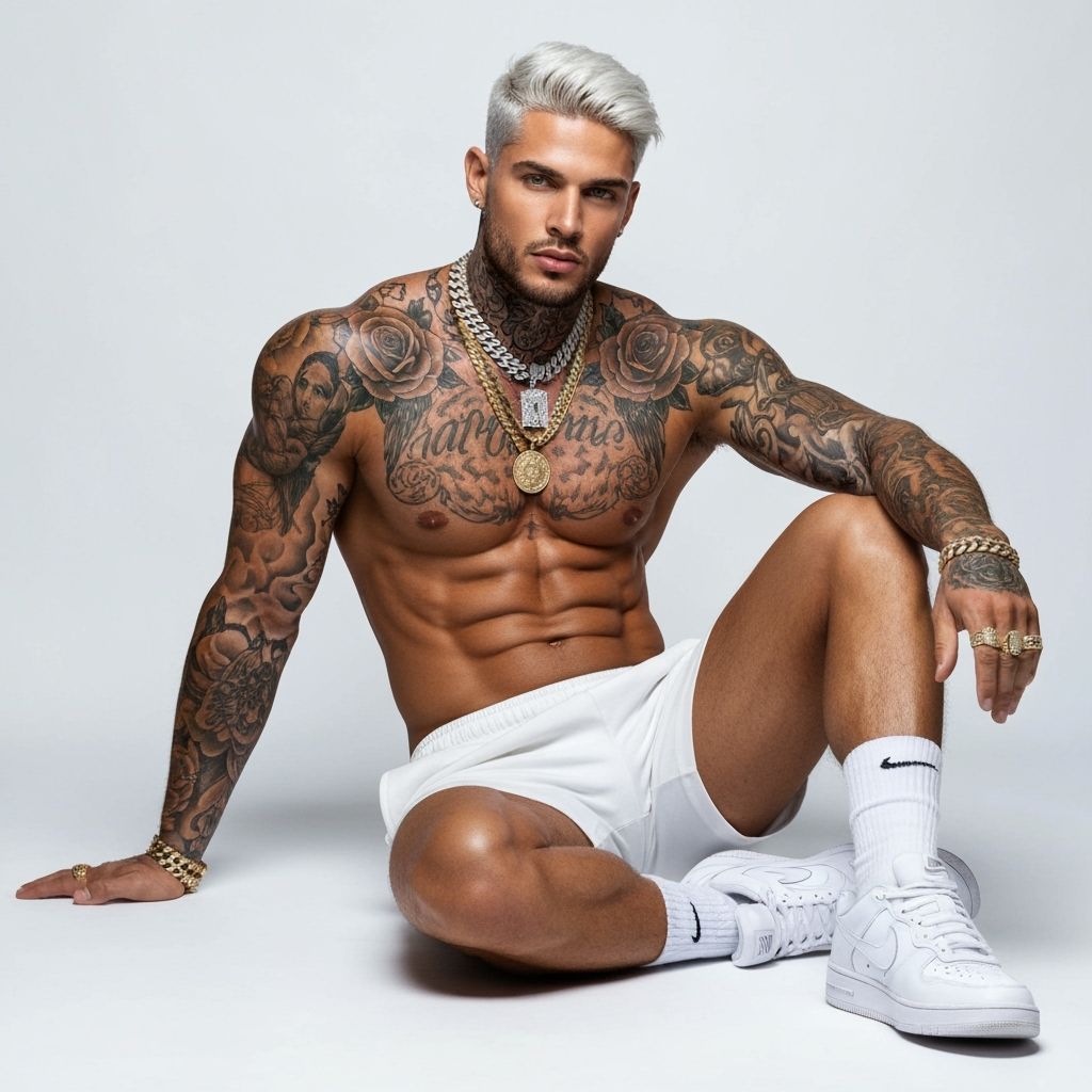 This image shows a heavily tattooed, muscular man in athletic shorts sitting in a studio. Gold jewelry accentuates his physique, and symmetrical tattoos adorn his upper body, rendered in a photorealistic style.