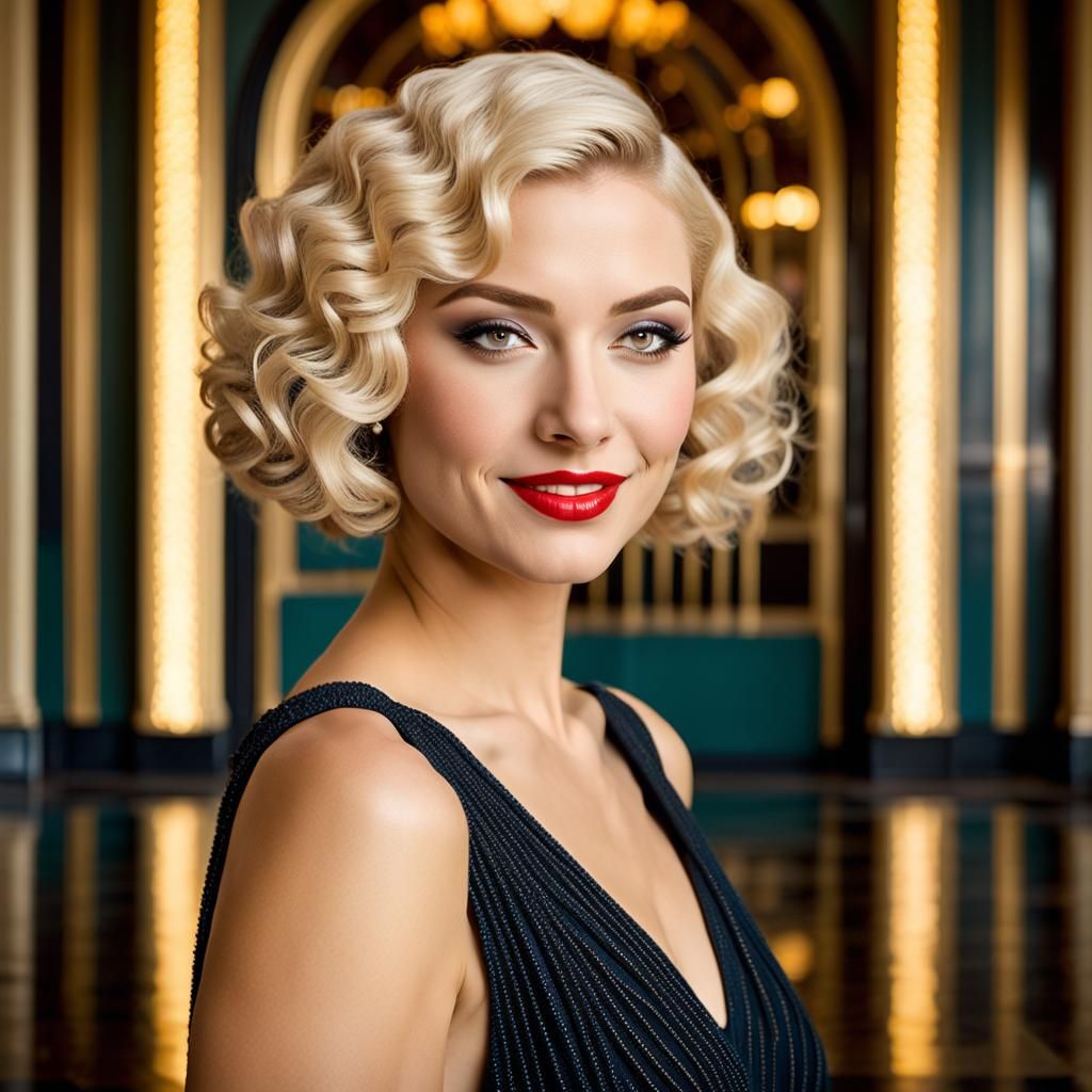 A close-up color portrait of a smiling, pretty 19-year-old woman with short blonde curly hair wearing 1920s art deco clothing, set against an art deco building interior with a shallow depth of field.