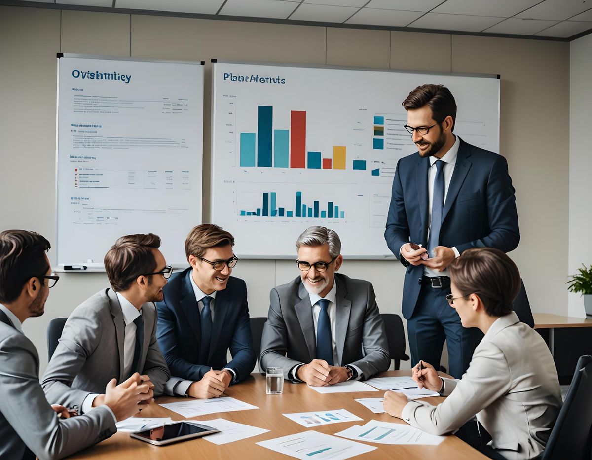 This image shows a group of middle managers in a conference room setting. They are discussing quarterly KPIs, likely in a business meeting environment.