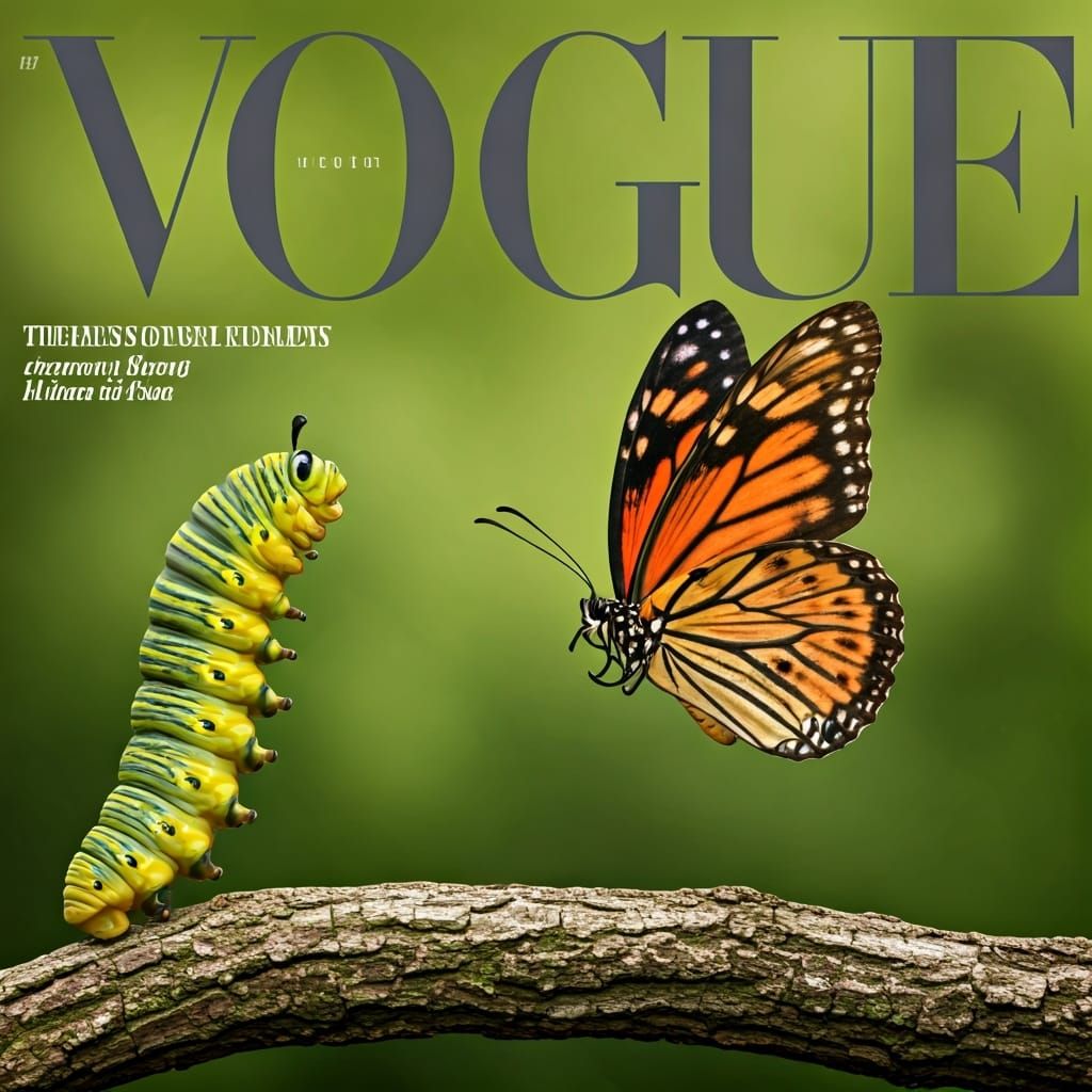 A whimsical Vogue cover featuring an excited caterpillar gazing at a beautiful butterfly. The image captures a sense of wonder and transformation.