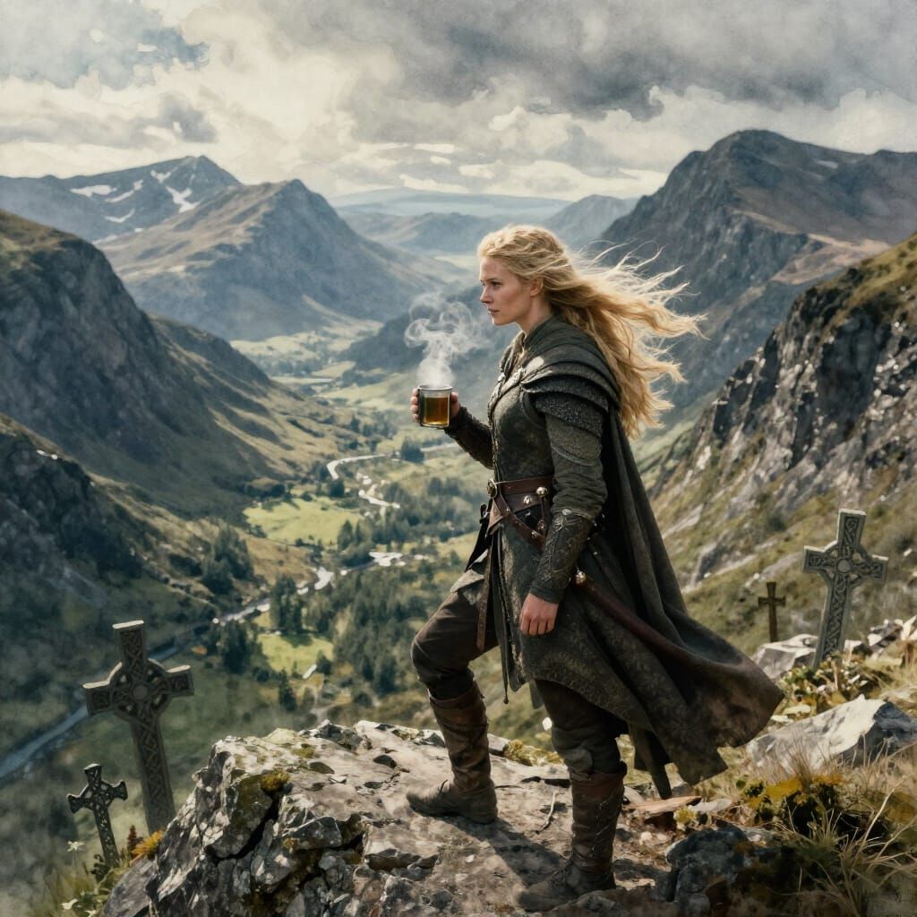 This image shows a lone warrior with windswept blonde hair on a mountain peak, holding a steaming mug of tea. The fantasy concept art features dramatic lighting and subtle watercolor textures.