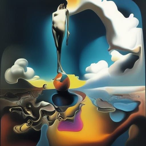 A surreal figure in a dreamlike distorted landscape. This oil on canvas artwork features melting clocks and objects, set against a matte background in vivid blues and oranges. The art style is surrealist.