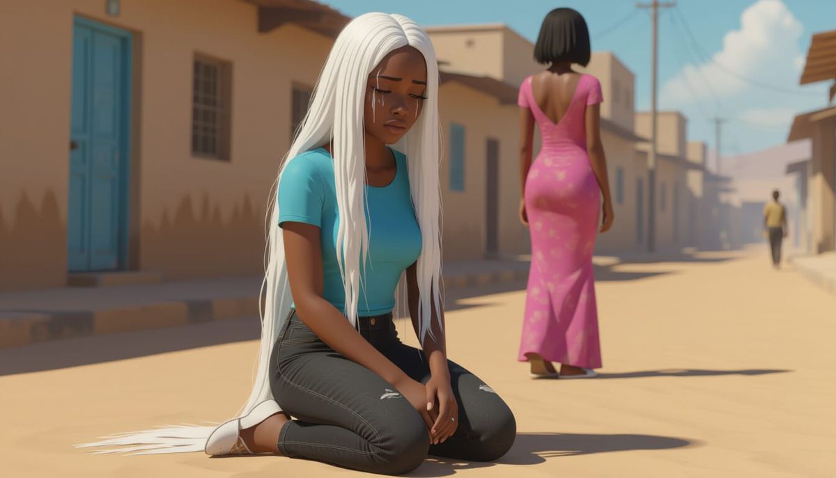 This hyperrealistic 3D animation shows a sorrowful young African woman in jeans and a blue t-shirt, clutching her sister's cloth with tears. Rendered with deep shadows and a realistic animated style.