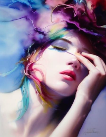 A vibrant watercolor of a water nymph in motion. The image features a pastel color palette and captures the nymph's energy and the fluidity of water in a colorful aesthetic.