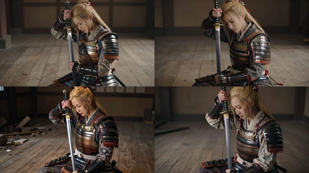 This hyper-realistic image captures a serene Asian female warrior in detailed samurai armor, holding a katana. Cinematic lighting and film grain enhance the atmospheric scene.