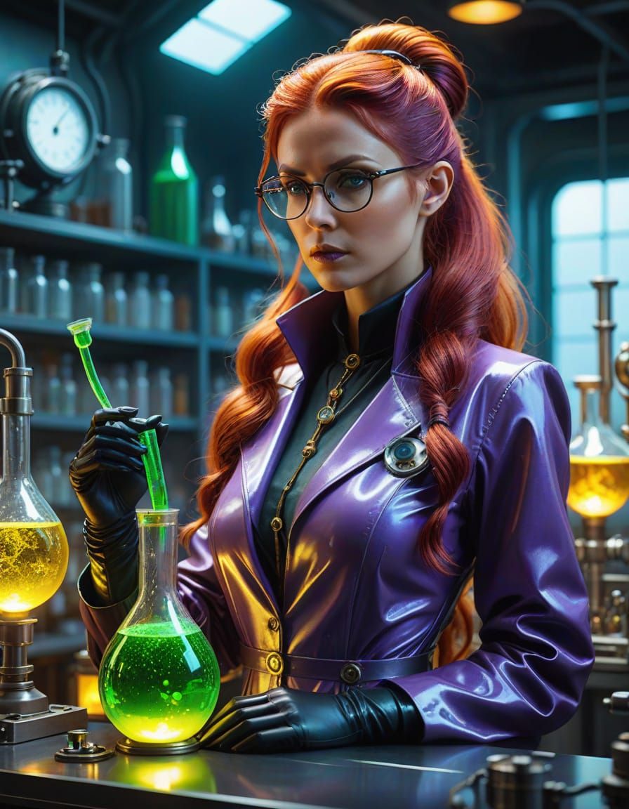 A mad scientist woman with glasses and long red hair pulled back into a ponytail stands in a futuristic laboratory, wearing long PVC sleeves and a long PVC lab coat, holding a flask with a green liquid resembling liquid latex. The liquid in the flask bubbles and shimmers with colors.