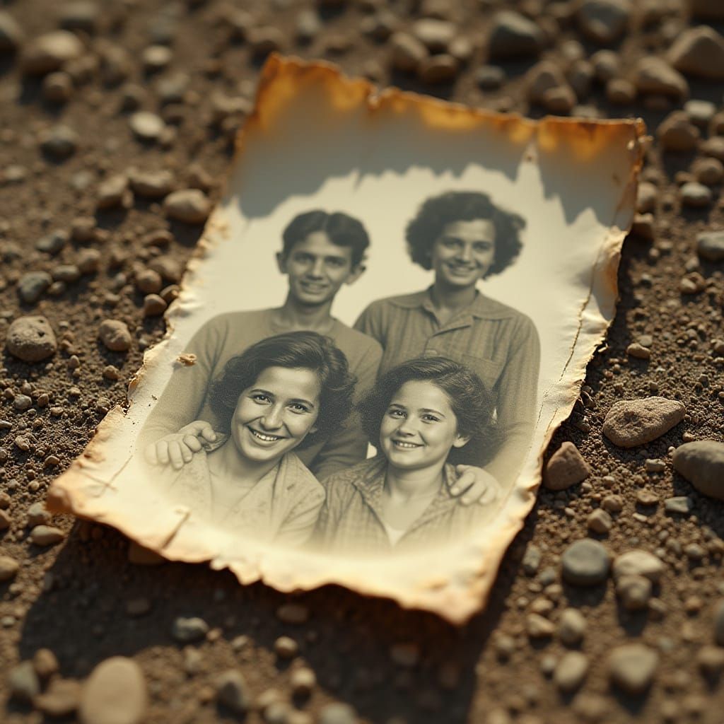 This image shows an old, damaged family photograph lying on dry, rocky ground. The cinematic style features soft lighting, subtle shadows and film grain, creating a vintage aesthetic.