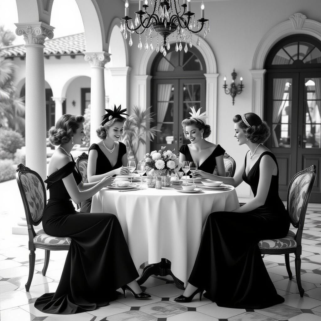 This image shows a black and white photograph of women in elegant 1940s dresses hosting a party at a luxurious villa. The image has a vintage photography aesthetic.