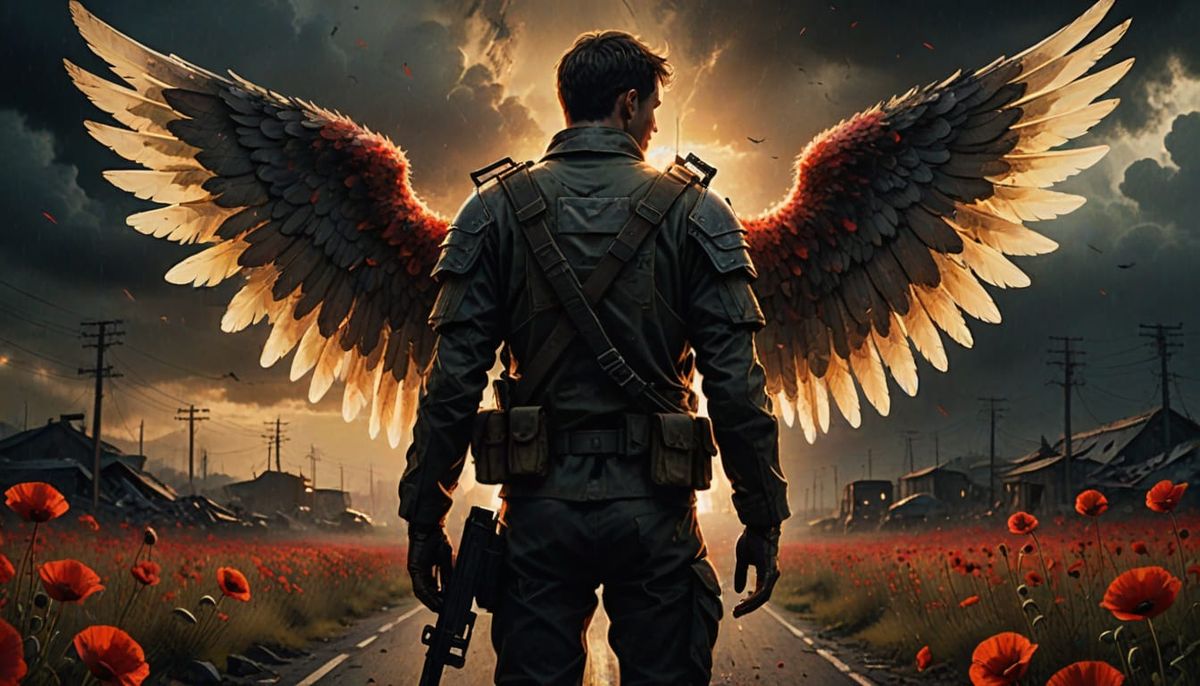 A dramatic image shows an angel in dark military clothing holding an unconscious soldier on a war-torn road. Golden light pierces through dark clouds in this cinematic oil painting.