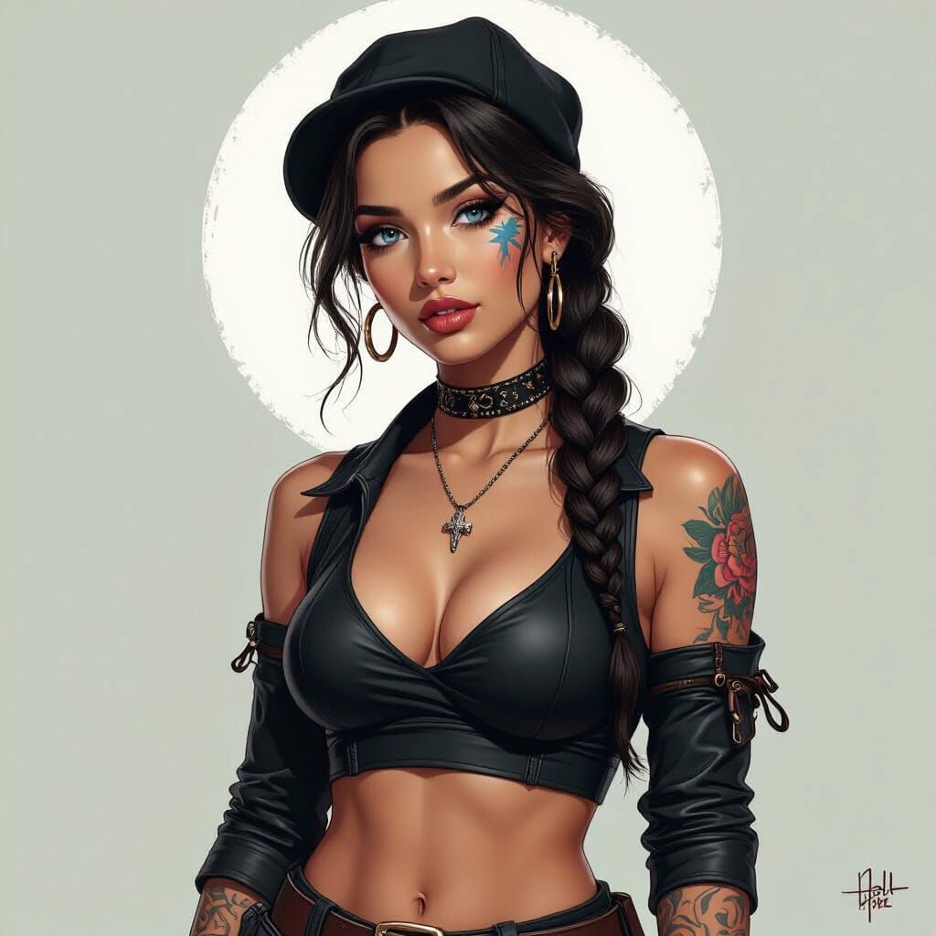A digital portrait of a woman with vitiligo, blue eyes, and a blue hydrangea tattoo. She wears a braid, a black beret, and a paint-splattered leather jacket in a realistic digital art style.