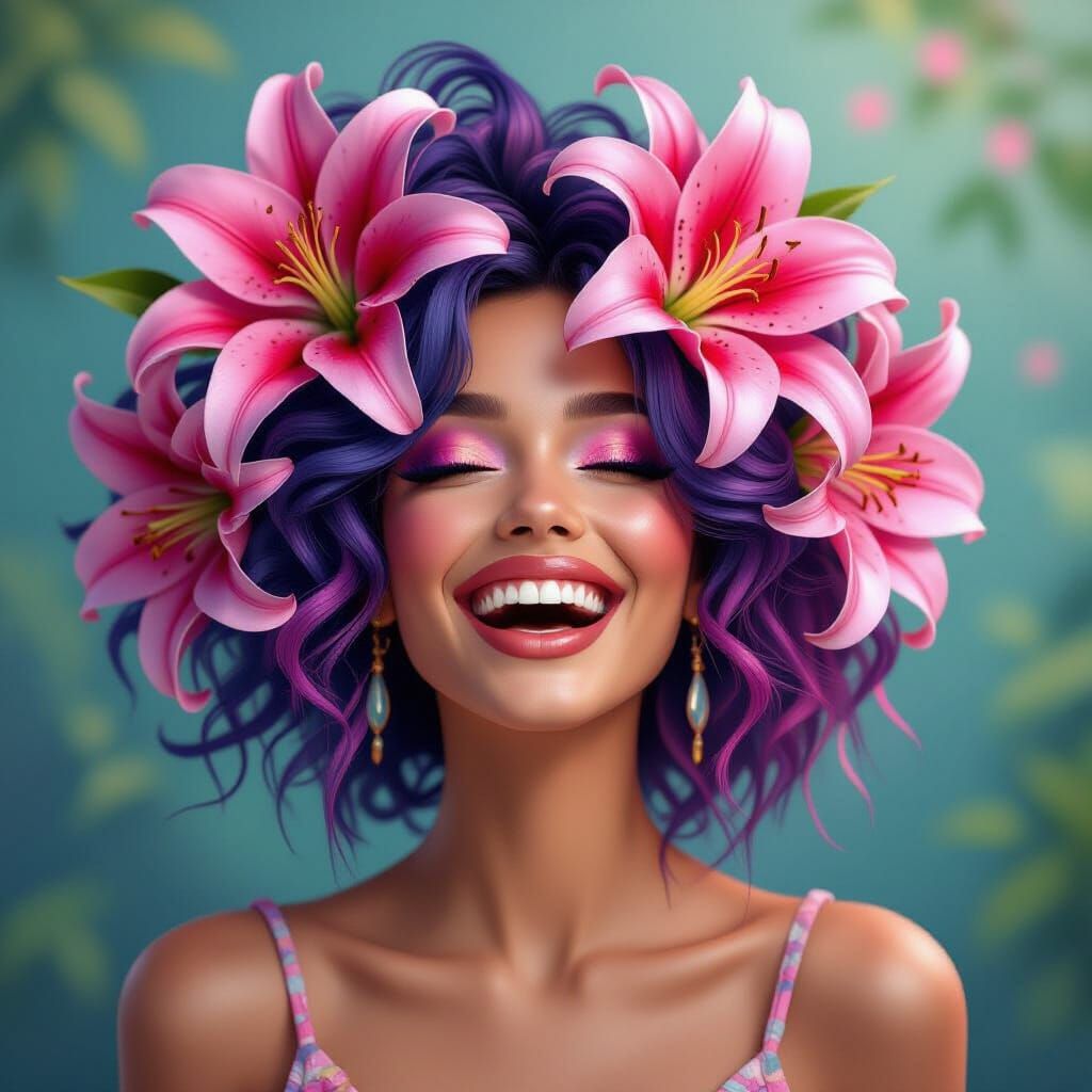 This image shows a fashionable lady with vibrant, wild hair and a pink stargazer lily. It's rendered as detailed fantasy concept art with deep, complementary colors.