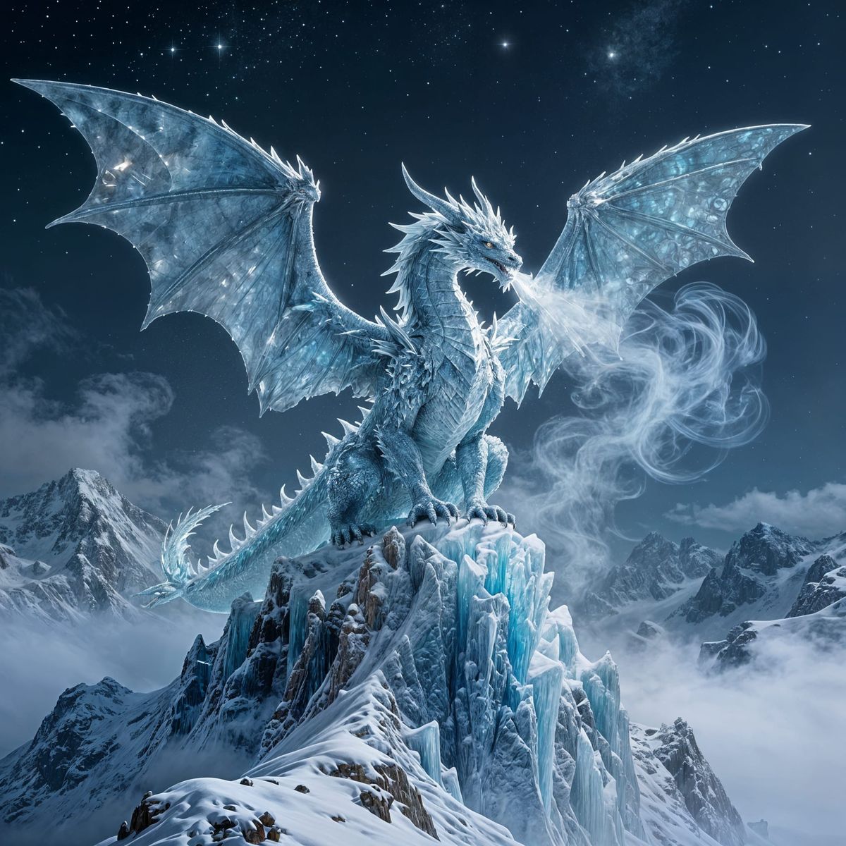 This image showcases a grand ice dragon resting on a snowy mountain. Its wings are spread, illuminated by moonlight, with frosty breath creating mist. Epic fantasy concept art with dramatic lighting.