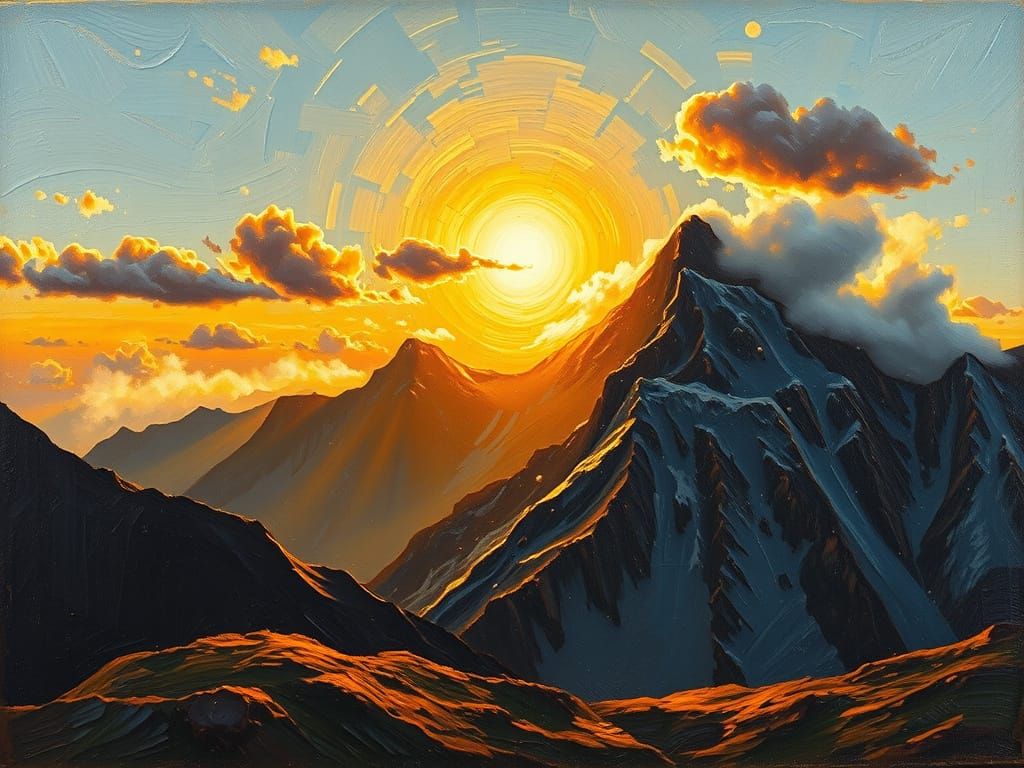 A striking picture of a mountain landscape bathed in golden light. The scene is rendered with thick, expressive oil impasto, using heavy palette knife strokes to create bold textures and deep shadows.