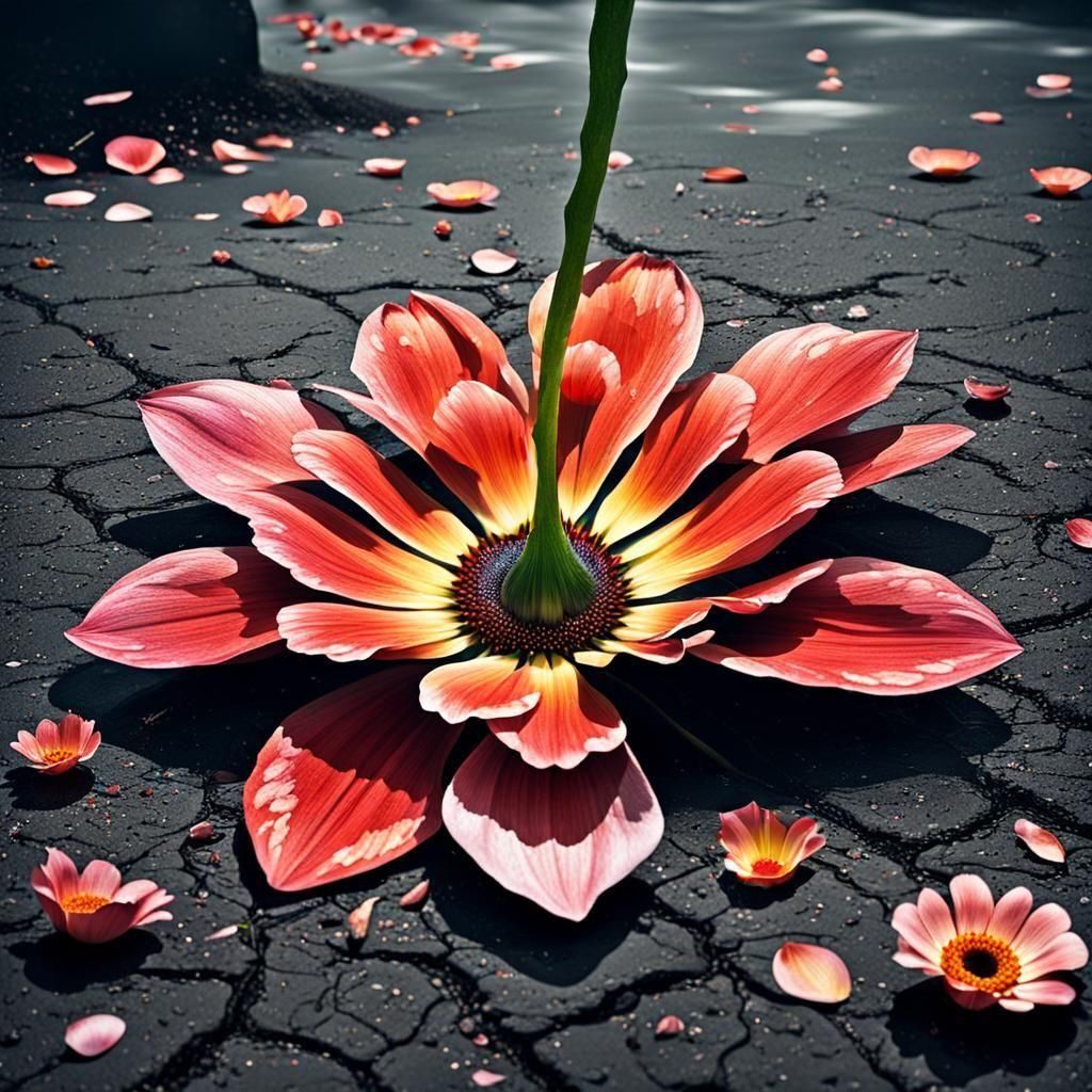 "freaky flower, surrealism, petals pour to the ground to make new freaky flowers"